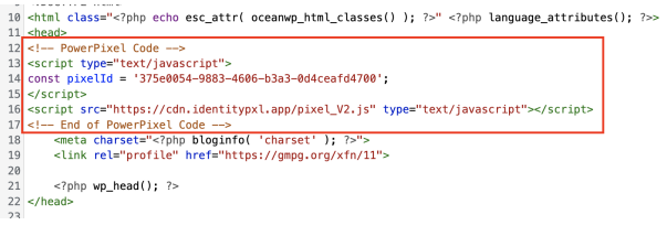 - Paste the PowerPixel code into the header.php file, just before the closing tag