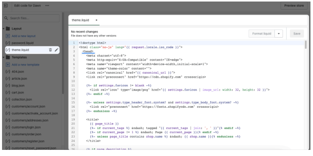 Go to the header section of your Shopify store’s theme from the theme.liquid part. Enter your